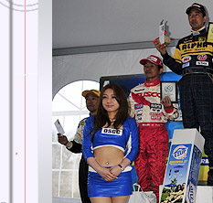 松崎充意選手(RX-7)が嬉しい全日本戦初優勝を飾るとともに、藤本泰則選手が2位、角岡隆志選手が3位と二戦連続でADVAN勢力を独占。さらにS2000の萩原宗宏選手も4位入賞を果たし、ADVAN勢がトップ4を独占する圧勝ぶりを見せた。