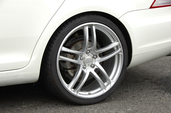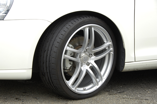 当社社長の愛車。通勤から各サーキットまでの移動手段としてだけでなく、サスペンションや装着タイヤの良さを体感して頂く為に、お客様に試乗をしていただいたりと大活躍している一台です。装着タイヤは「ADVAN Sports」。 225/35-19という超扁平でありながら、乗り心地は非常に良く、社長も大満足しています。