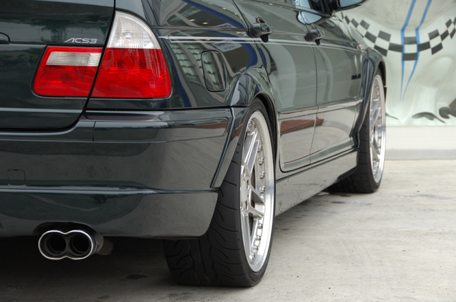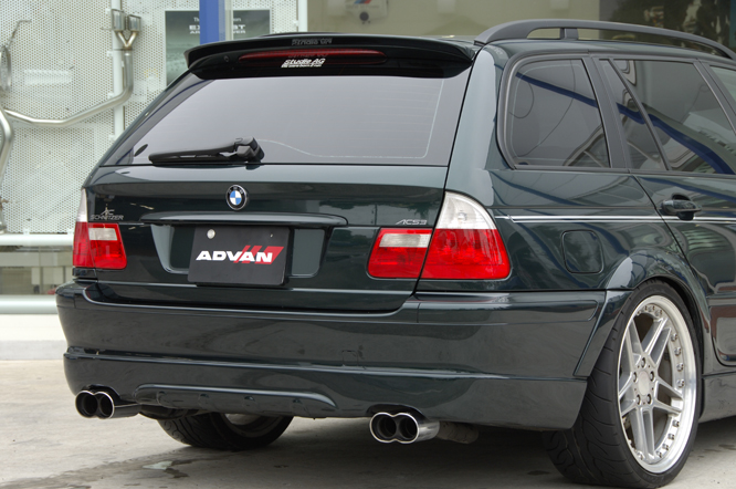 派手に見えないように仕上げながらも存在感を残せるようにしました。E46/318ツーリング車輌をACS社製の「X-ROAD BodyKIt」でさりげなく細身のボディーにボリュームを持たせ、足回り、ブレーキ、吸排気などの機能パーツを装着し「走る」「曲がる」「止まる」を基本に触れる、シート、ステアリング、パネルなどインテリアまでドライバーがいつまでも乗っていたいと思える車に仕上げてあります。