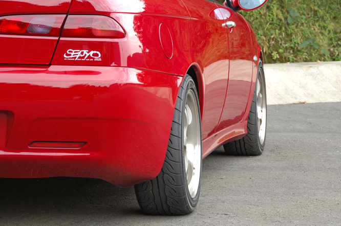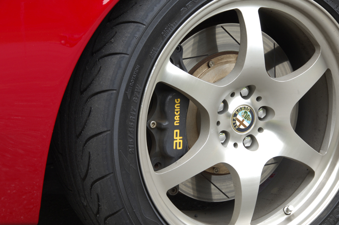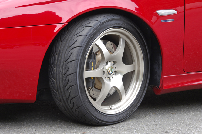 成城タイヤのデモカーとしてお客様の試乗やタイヤテストに取材車両、そして日常では買い物から子供達の幼稚園の送迎と、街乗りからサーキット走行まで幅広く活躍するアルファロメオ156。サーキット走行時には「ADVAN NEOVA AD08」で足元を固めておりますが、普段は静粛性が高く乗り心地の良いといった居住性を重視しているにもかかわらず剛性感のある「ADVAN dB」で快適に走行しております。