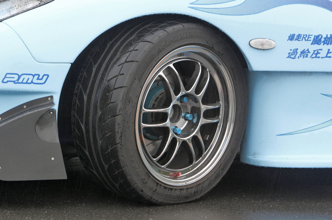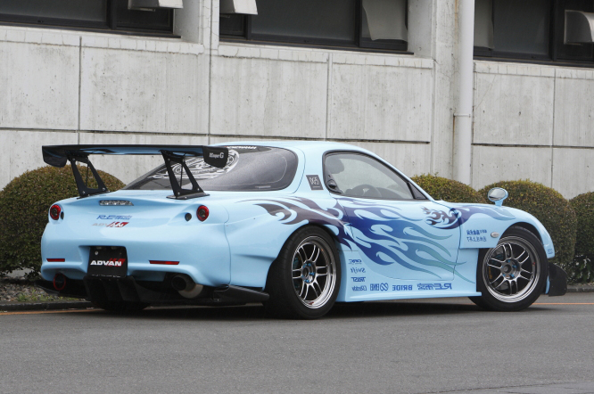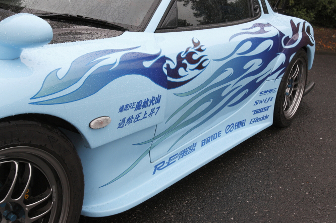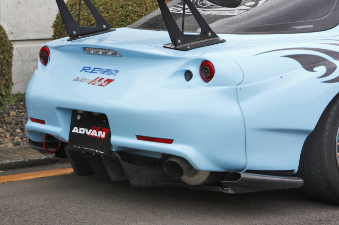 RE雨宮の代名詞といってもいいAD GT KITを装着し、その他リアバンパーはこの車両にしか装着していないタイプでもあり、各所に拘りが見える車両です。特にオーナーの拘りは、サイドのグラフィック。ストリートからサーキットまで十分に楽しめる仕様です。