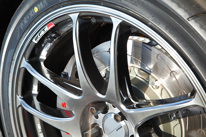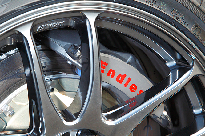 18インチのスポーツタイヤ 「NEOVA」に大径6POTのモノブロックキャリパを装着しながらも、内装には限定レッドレザーのレカロシートを装着し、少し大人なスポーツカーをコーディネートしました。ミニサーキットから街乗りまで幅広く対応できるライドハイトやサスペンションセッティングですが、フロントアンダーリップスポイラーのビジュアル効果によりフロントビューはしっかりと引き締まっています。アクセントにグリミットシルバーのWORK EMOTION CR KIWAMIを装着し、大人の雰囲気のなかにもスポーツマインドが輝くデモカーとなっております。