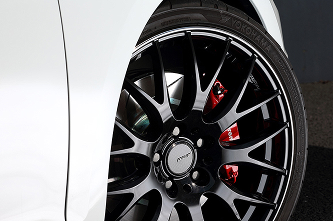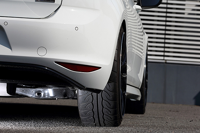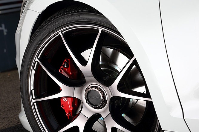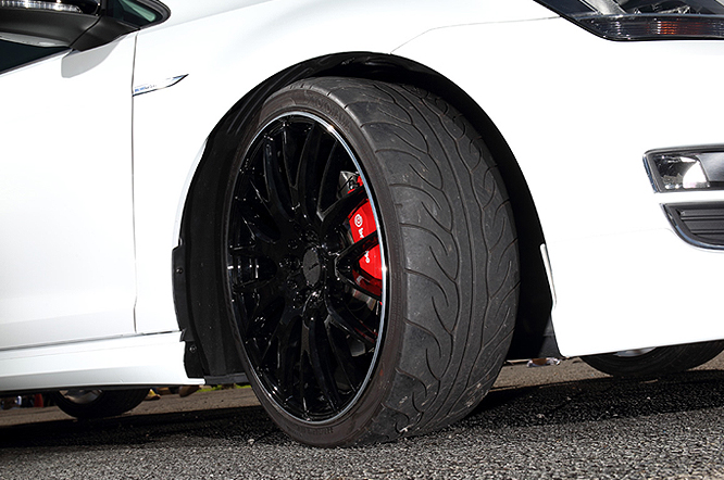純正の良さを生かしたモディファイにするため純正流用品も利用。エクステリアではルーフ、ミラーカバーをブラック化してアクセントにしたほかm+フロントスポイラー、VW純正サイドスカートを装着してワイド&ローなスタイルに仕立てました。足回りは17インチの純正ホイールにも装着可能なBremboのGT Kitを選択。吸排気系にはVW純正のセンターマフラー+専用リアディフューザーを装着して見て目もスポーティな印象となっています。インテリアはELDINEのオーダーメイドシートカバーで高級感をアップさせています。
