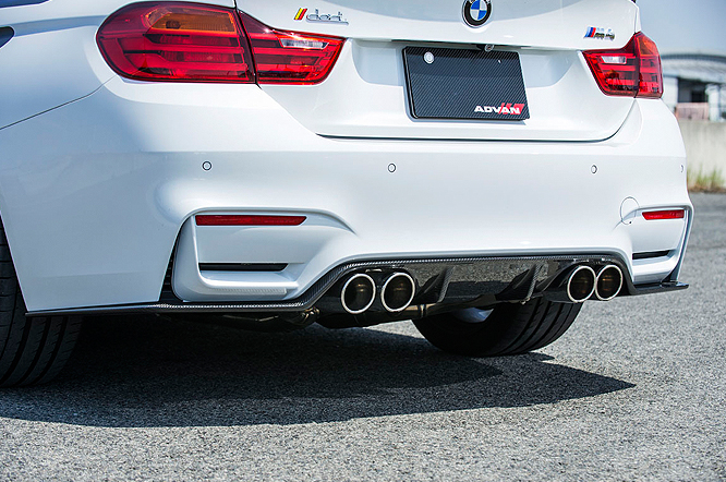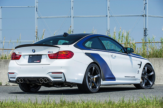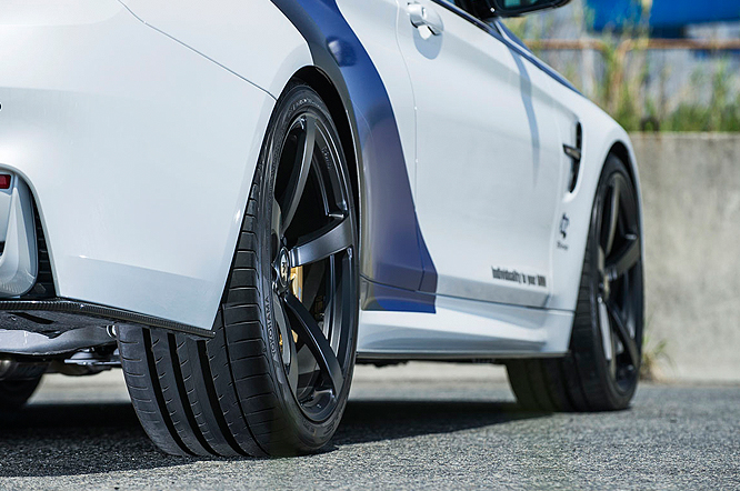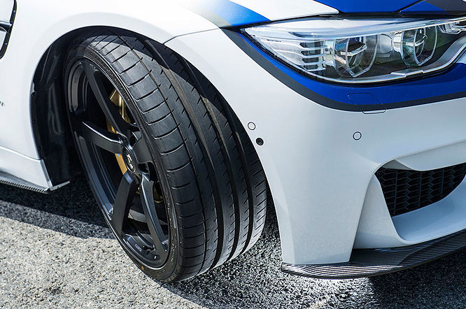 ドライカーボン製のエアロパーツを始めとし、超軽量鍛造ホイール、アルミシェルケース採用の車高調キットなど、機能面も追求した各アイテムでトータルに仕上げた M4。 特にホイール、タイヤ、サスペンションのセッティングバランスは軽快なフットワークを提供します。