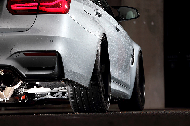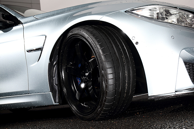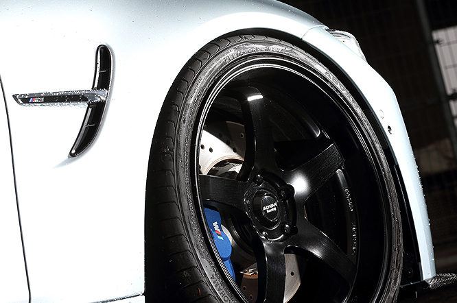 5代目から4ドアのみとなったM3。3Dデザインのエアロを装着したシルバーボディに、セミグロスブラックの「ADVAN Racing GT」20インチを装着。合わせるタイヤはADVAN Sport V105を選び、上質なスポーティな仕様に仕上げている。フロントグリルには赤と青のMストライプを施し、誇り高きMの高性能をしっかりと主張。