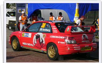 ランキングトップに立ったソルベルグ選手が駆るスバルインプレッサ。ボディに描かれたイラストは「RED DEVIL」という栄養系ドリンクのキャラクター。