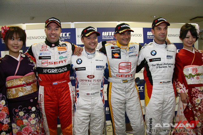 予選トップタイムはセアトのタルクィーニ選手。予選後の記者会見には艶やかな晴れ着姿のWTCCギャルも華を添えた。