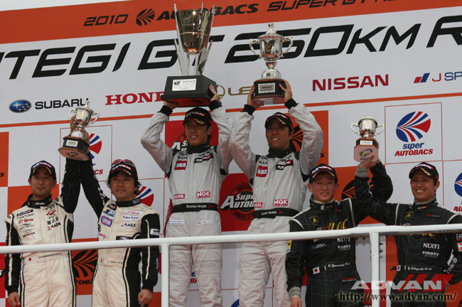 最終戦のGT300クラス、その表彰台はADVANが独占。マシンを問わず速さと強さを発揮する高いポテンシャルを見せつけた。