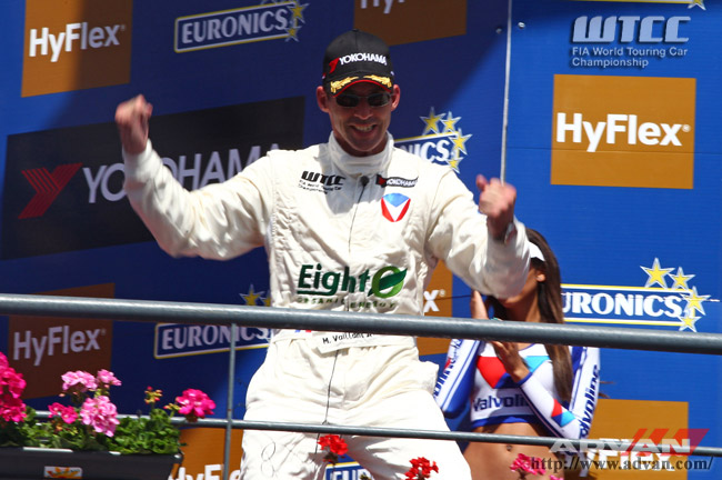独走のレース展開で優勝を飾ったメニュ選手。レーシングスーツのドライバー名も「ミシェル・ヴァイヨン」となっている。