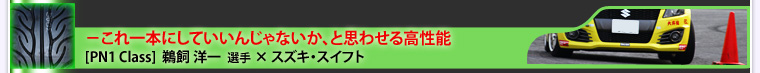 PN1クラスは排気量1,600cc以下の2輪駆動、コンパクトハッチが鎬を削りあう中でスズキ・スイフトを駆る鵜飼洋一選手が唯一の1分24秒台となる1分24秒906をマークして優勝を飾った。