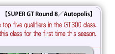 The qualifying sessions of the GT300 class were dominated by ADVAN equipped cars. Confirming its recent good form, JIMCENTER ADVAN F430, of which Tetsuya Tanaka took the wheel, was the only car to register the time in the 1 minute 50 second bracket in the Super Lap and took the pole position of the class. This was Tanaka's first pole position in five years since he accomplished the same feat here in the seventh round of 2003, the year Autopolis was added to the calendar for the first time. The ADVAN shoed Ferrari was followed by Daishin ADVAN Z, Privee KENZO Asset Shiden, WedsSport IS350 and Yunker Power Taisan Porsche, which meant the top five slots were occupied by ADVAN users.