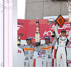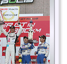 The medium tires took longer to warm up than the soft tires. Nevertheless, Fujii kept a frenetic pace from his out-lap and steadily moved up the ranks while the rivals made their routine stops one after another. When all cars completed their stops, Fujii found himself in the top slot by more than 30 seconds. He continued to run the remaining laps without making any mistakes and brought back the gleeful first victory for the Daishin team which had come back to the Super GT series this year.