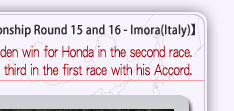 Thompson's momentum seemed to be unstoppable even in the closing phase of the race. He continued to play out head-to-head battles which were typical of a WTCC event and caught up to Huff's Chevrolet which was running third at that time. On Lap 10 (with 2 laps to go), the Honda driver squeezed into the inside of his fellow countryman at the first left-hander of Rivazza and, after running through the corner side-by-side, robbed him of third place at the next left-hander.