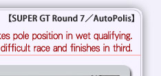 The seventh round of the 2012 Super GT series was held at Autopolis in Kyusyu, Japan. The circuit is located in the hilly area close to the border between the Ohita and Kumamoto prefectures and features a significant height difference. The race was hit by intermittent rain but the Yokohama tires performed very well under the difficult wet conditions in both of the GT500 and GT300 classes.
