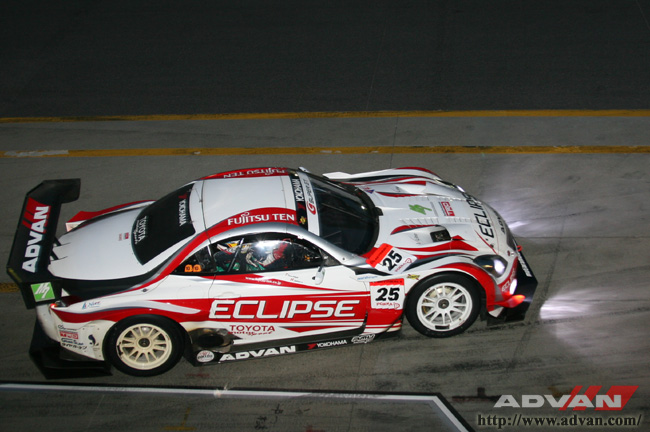 ヘッドライトを点灯してピットを離れる「ECLIPSE ADVAN SC430」。夜間走行でドライバーは高い集中力が求められる。