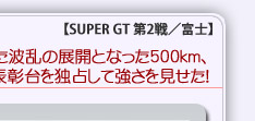 マシンは国産車初のFIA-GT3であるGT-R NISMO GT3とあって、注目度も極めて高く、今季最も話題とされるチームといっても過言ではないだろう。初レースとなる前回の岡山国際サーキットでのレースでは、表彰台も夢ではないポジションを走行したものの、S-GTデビューの千代選手が不意にインを開けてしまったことが災いし、GT500車両に追突されてコースアウト。目指した結果を残すことはできなかったとはいえ、高い可能性を示すこととなった。