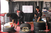 開放感のあるサービス・テントには、大画面のモニターが設置されていて、常にWRCやWTCCなどモータースポーツの映像を流しています。今回はWRCの映像が特に好評で、観客、ラリー関係者はもちろんのこと、他のタイヤメーカーの人達も足を止め、テント内のモニターを見つめていました。